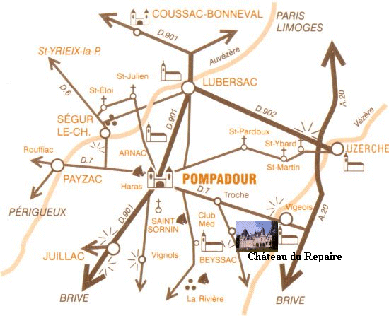 Le Château du Repaire, situé entre Pompadour, Uzerche, Brive, (sortie autoroute A20 n°45) et à proximité de Tulle en Corrèze dans le Limousin.